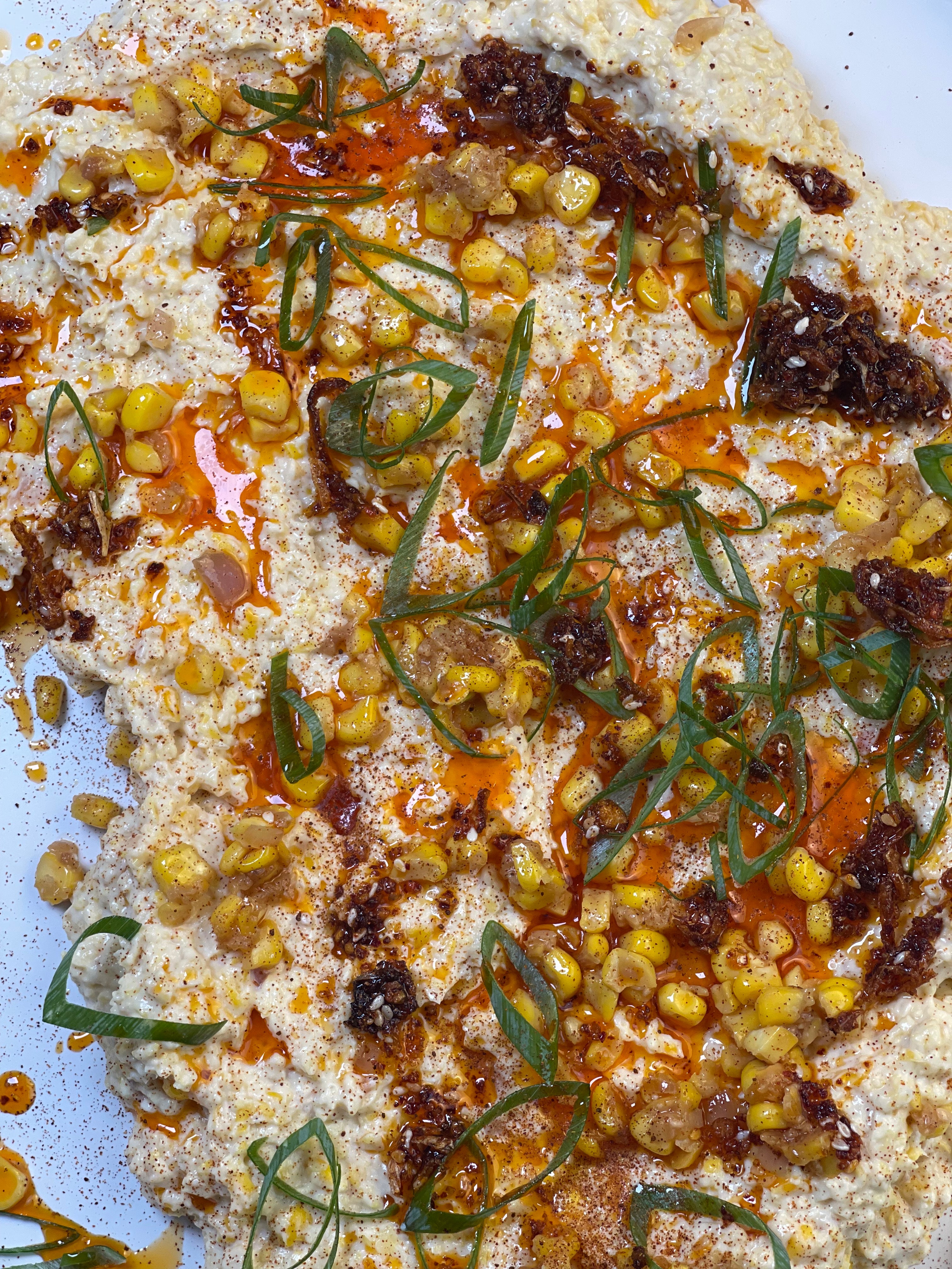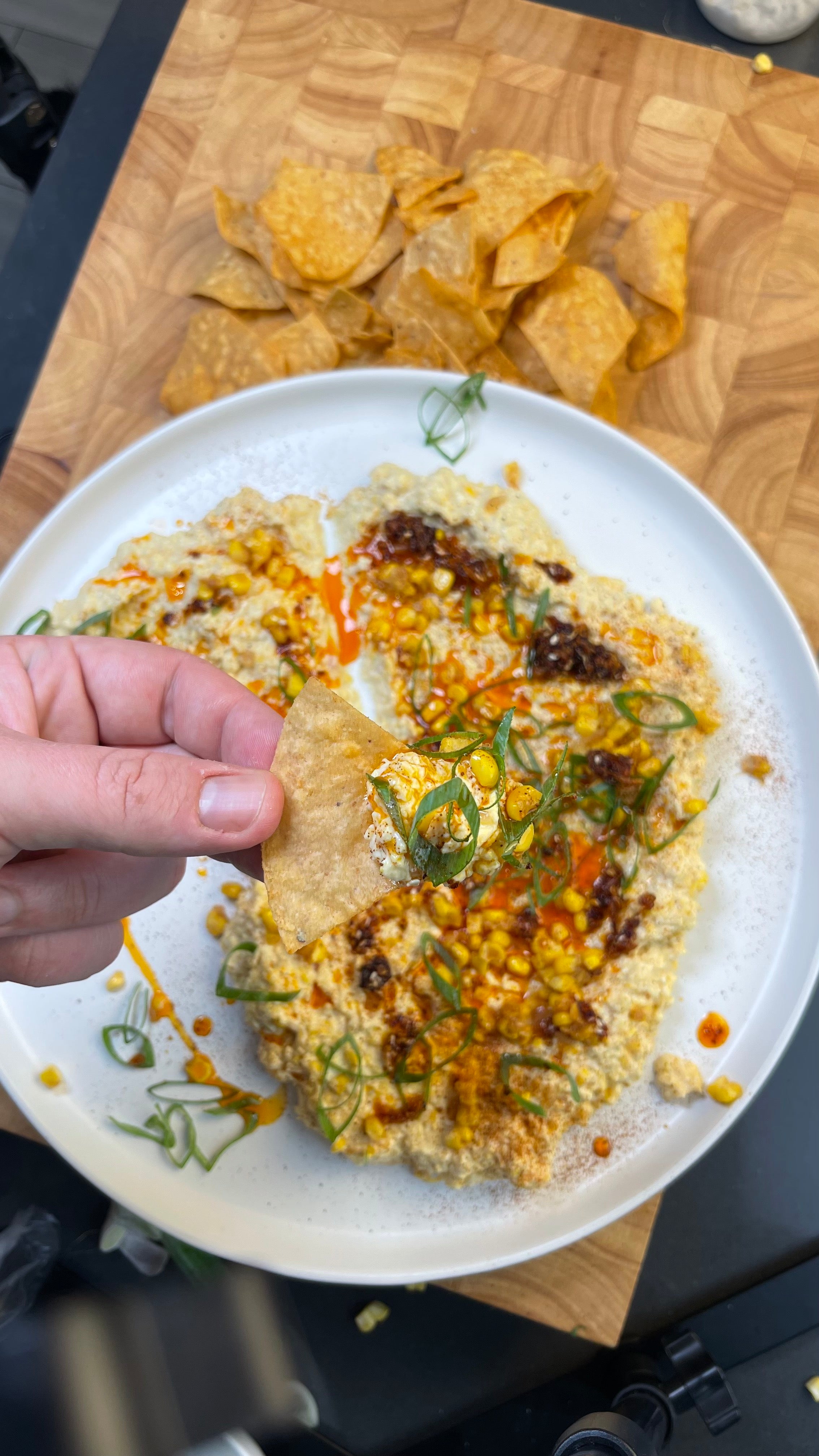 Serve on a plate and top with Spring onions, chilli oil, fresh herbs, sweet paprika and serve with your fav chips or crackers!